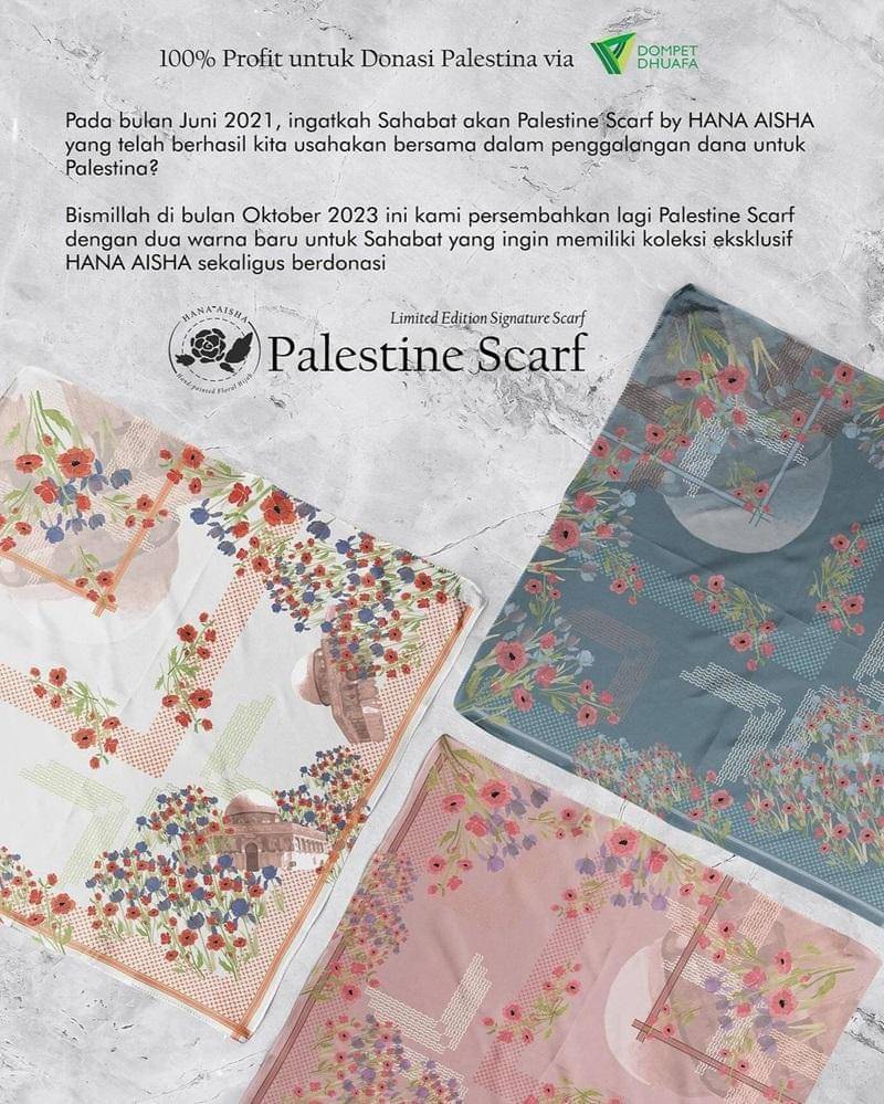 Brand hijab lain yang turut berdonasi adalah Hana Aisha. Mereka mengeluarkan series Palestine Scarf yang mana 100% dari hasil penjualan mereka akan disalurkan ke Palestina melalui Dompet Dhuafa.