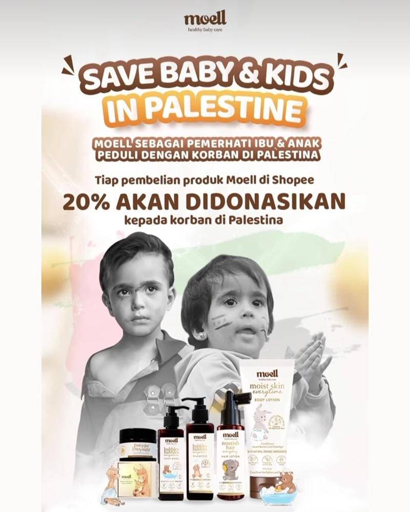 Produk perawatan bayi bernama Moell pun tergerak hatinya untuk turut mendonasikan hasil penjualannya. Saat ini, mereka sudah memiliki produk-produk khusus yang penjualannya akan disumbangkan ke Palestina.
