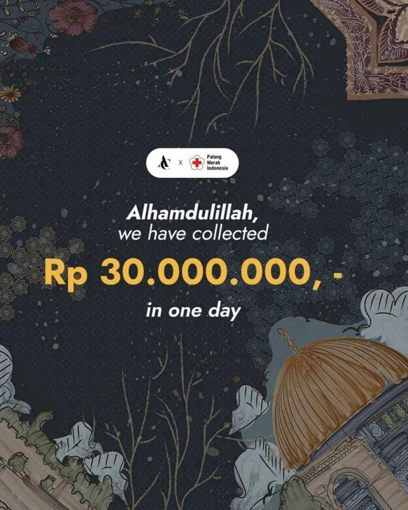 Brand yang satu ini juga cukup aktif menggaungkan aksi kemanusiaan. Kali ini mereka memberikan sebagian hasil penjualan Jeehad Series untuk ke Gaza. Di hari pertama, mereka berhasil mengumpulkan sebanyak Rp 150 juta.
