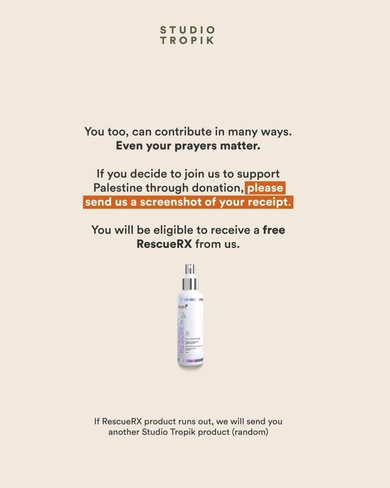 Brand beauty lokal Studio Tropik punya cara yang unik untuk berdonasi dan meminta orang lain untuk berdonasi. Tidak dengan cara membeli produk miliknya, malah memberikan produk miliknya kepada siapa saja yang sudah berdonasi untuk Palestina.