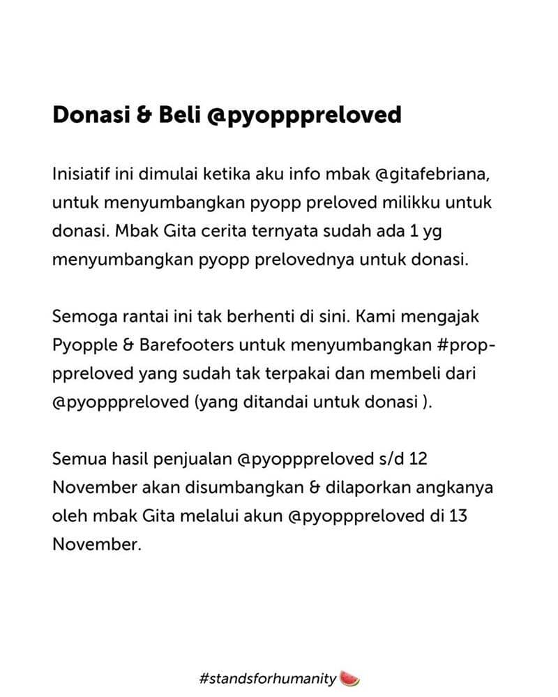 Brand sepatu barefoot lokal, Pyopp juga berpartisipasi. Mereka membuat gerakan menyumbangkan hasil penjualan produk Pyopp preloved mereka untuk Palestina.