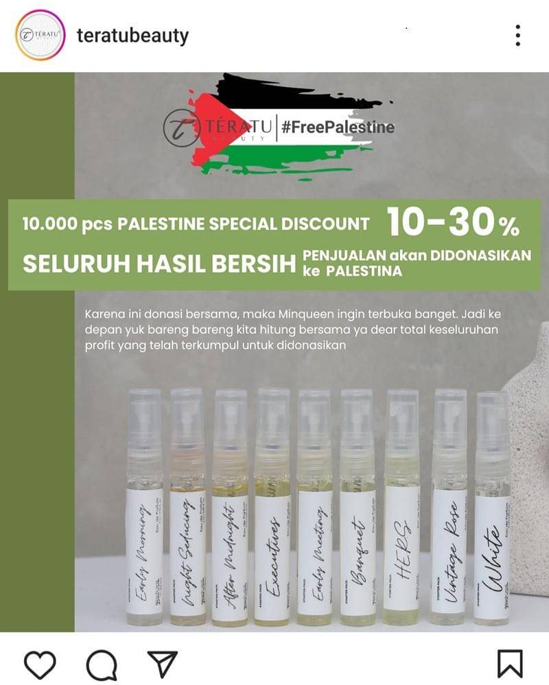 Brand lokal yang satu ini menjual sekitar 10.000 buah EDP Starter Pack dalam harga diskon dari 10-30%. Nantinya, semua keuntungan dari penjualan tersebut akan didonasikan ke Palestina melalui beberapa channel penyaluran.