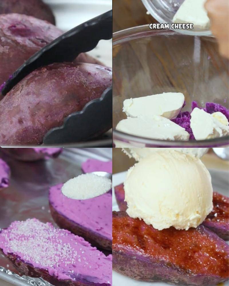 Menampilkan lapisan halus ubi ungu yang manis dan cerah. Lalu, di atasnya diberi lapisan gula karamel. Hasilnya? Kamu akan merasakan rasa manis karamel dengan lembutnya ubi. Kombinasi tekstur lembut ubi, ditambah cream cheese lezat, menciptakan pengalaman rasa yang memikat di setiap gigitan.
