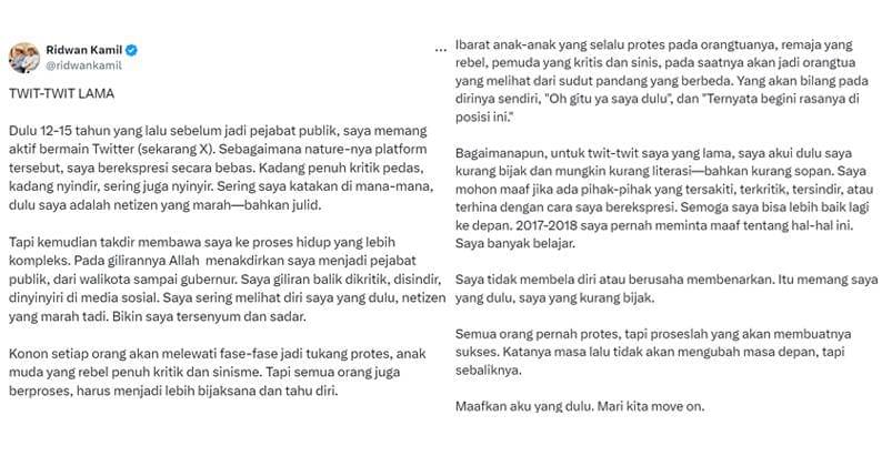 Ia menyampaikan permohonan maaf di hadapan pengguna internet melalui platform X pribadinya sekaligus mengajak mereka untuk move on dengan cuitan-cuitan lama itu.