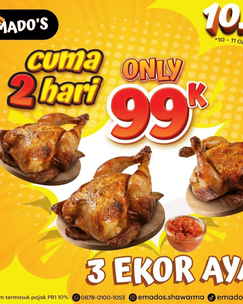 Untuk menu ayam, ada Emado's yang menggelar promo 10.10. Promonya adalah pembelian 3 ayam dengan harga Rp 99 ribu.