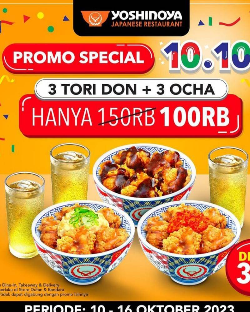 Ingin makan berat? Cobalah Yoshinoya. Untuk promo 10.10, ada paket diskon Rp 100.000. Mama bisa membeli 3 tori don dan 3 ocha dengan selembar Rp 100 ribu.