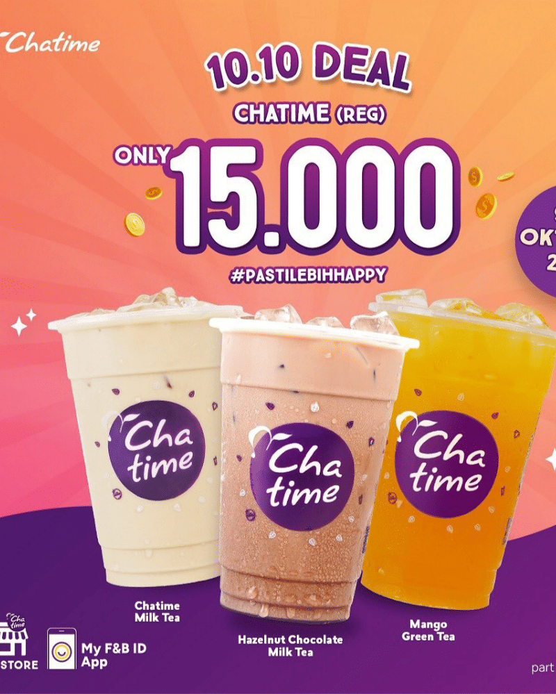Selanjutnya dari Chatime yaitu diskon menu Chatime Milk Tea, Hazelnut Chocolate Milk Tea, dan Mango Green Tea menjadi hanya Rp 15.000. Promo ini berlaku dari tanggal 9-13 Oktober 2023.
