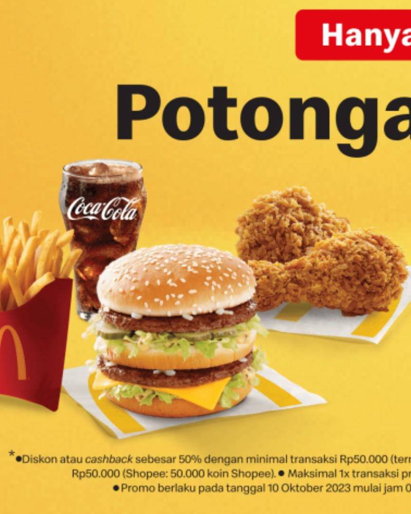 Promo pertama datang dari McD. Di tanggal 10 Oktober 2023, ada cashback sebesar 50% untuk pembelian menu sebesar Rp 50.000.