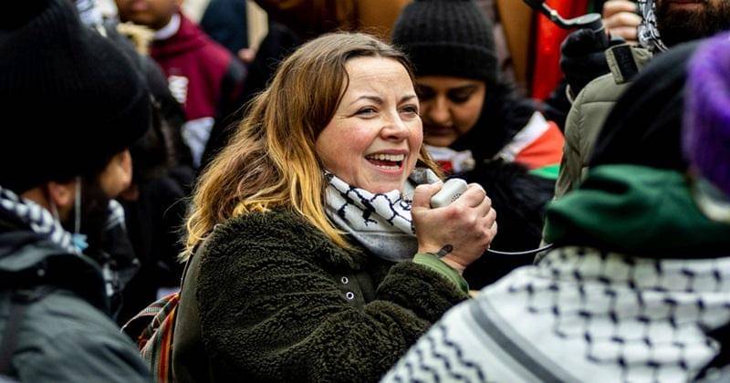 Ia terlihat mengenakan kaus bertuliskan "Ceasefire NOW" dan membawa banner "The whole world is watching". Ia pun ditangkap atas aksinya itu dan tampak tetap tenang meski sudah dibawa polisi.