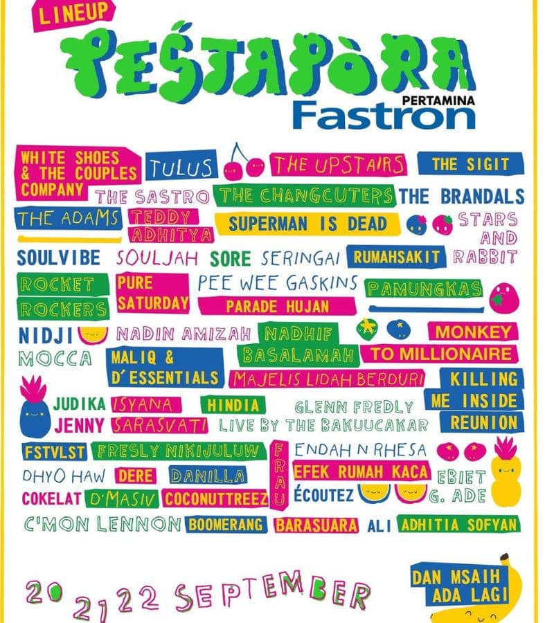 White Shoes & The Couples Company, The Changcuters, Nadin Amizah, Pamungkas, Rumahsakit, Barasuara, Isyana Sarasvati, Efek Rumah Kaca, dan Souljah menjadi deretan musisi yang sudah dipastikan tampil di Pestapora tahun ini.