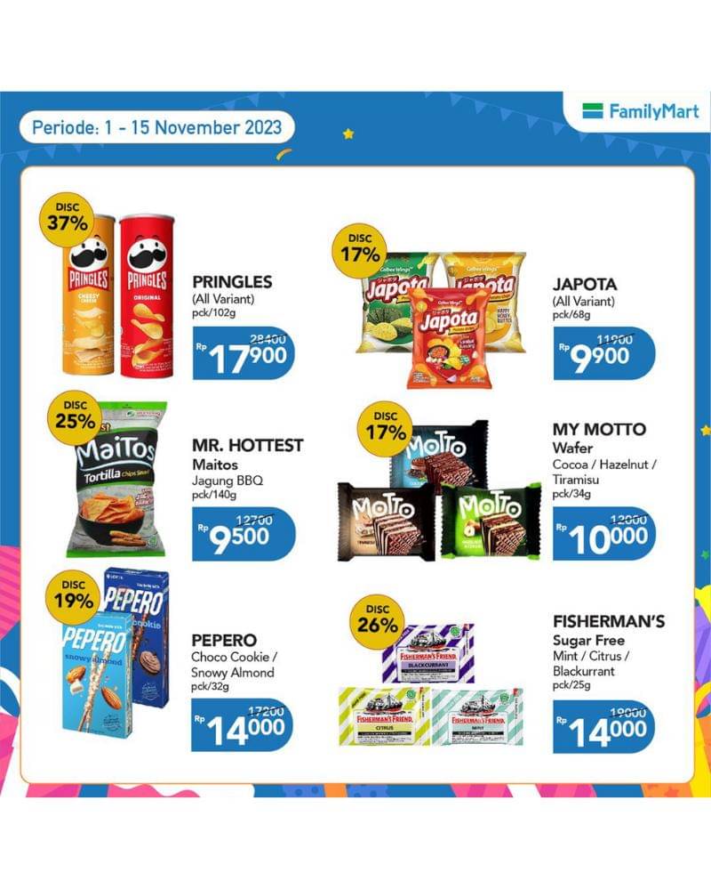 - Untuk kamu yang nggak bisa hidup tanpa ngemil, kamu datang ke tempat yang tepat. Karena FamilyMart lagi ada promo makanan ringan yang bervariasi. Ada, keripik Pringles seharga Rp 17.900/ 102g, lalu wafer My Motto rasa cocoa, hazelnut dan tiramisu, seharga Rp 10.000/ 34g, dan Japota semua varian seharga Rp 9.900.