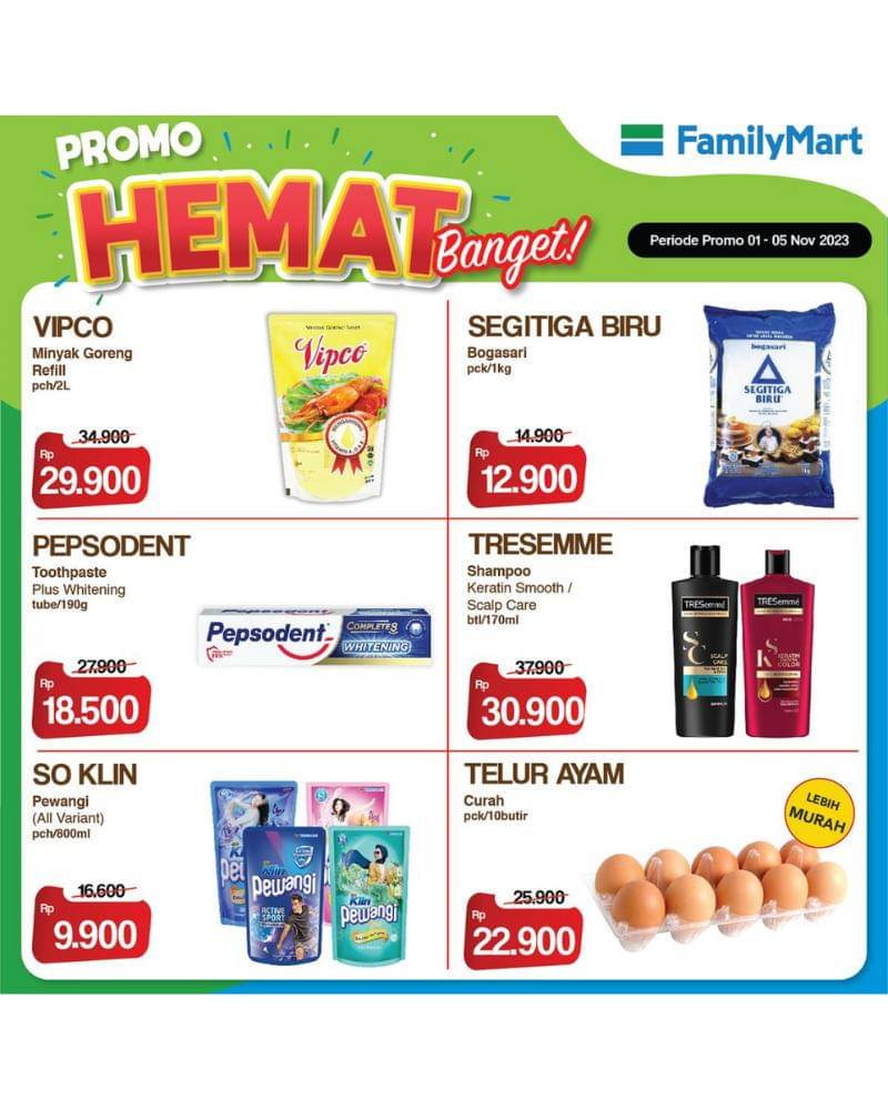 - Kalau kamu sedang cari kebutuhan rumah ada Promo Hemat Banget dari FamilyMart yang menggiurkan, nih. Ada telur ayam curah seharga Rp 22.900/ 10 butir, dan ada pasta gigi Pepsodent Plus Whitening seharga Rp 18.500/190g.
