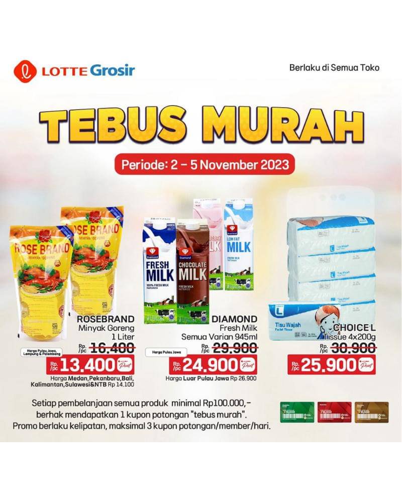 - Penawaran tebus murah untuk para member Lotte Grosir, yang menawarkan produk tissue 4X200g Choice L, susu UHT 945ml dari Diamond, dan minyak goreng 1 liter Rosebrand.