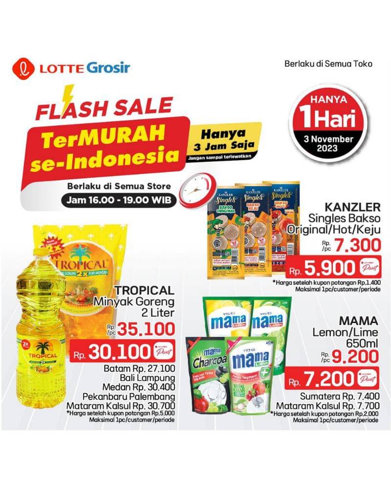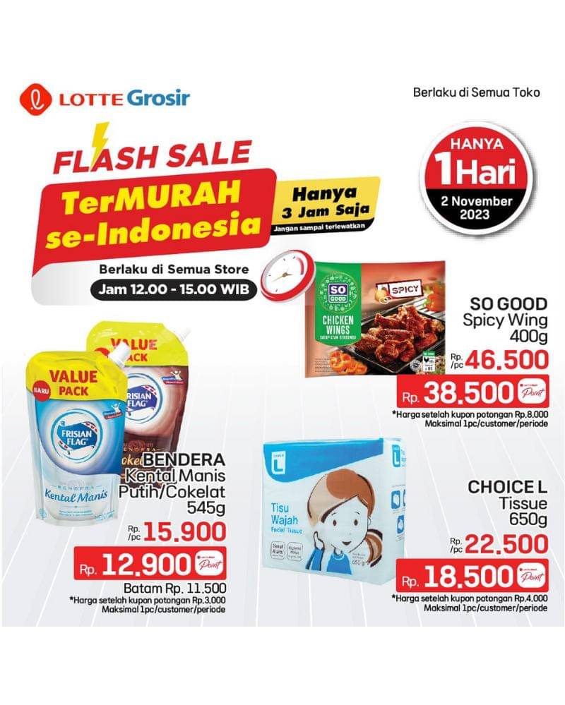 - Penawaran flash sale yang diadakan 2 hari berturut-turut. Flash sale 2 November diadakan pada jam 12.00 - 15.00 WIB, di semua store Lotte Grosir.. Sedangkan, untuk 3 November 2023 akan diadakan pada jam 16.00 - 19.00 WIB, di semua store Lotte Grosir.