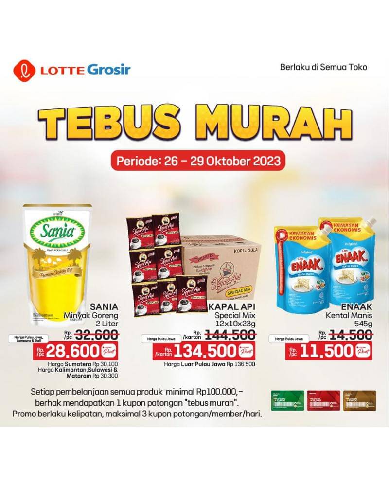 Untuk Mama dan Papa yang sudah menjadi member Lotte Grosir, nih ada promo tebus murah. Setiap pembelanjaan semua produk minimal Rp 100.000, kamu berhak mendapatkan 1 kupon potongan "tebus murah". Promonya juga berlaku kelipatan, maksimal 3 kupon potongan/member/hari.
