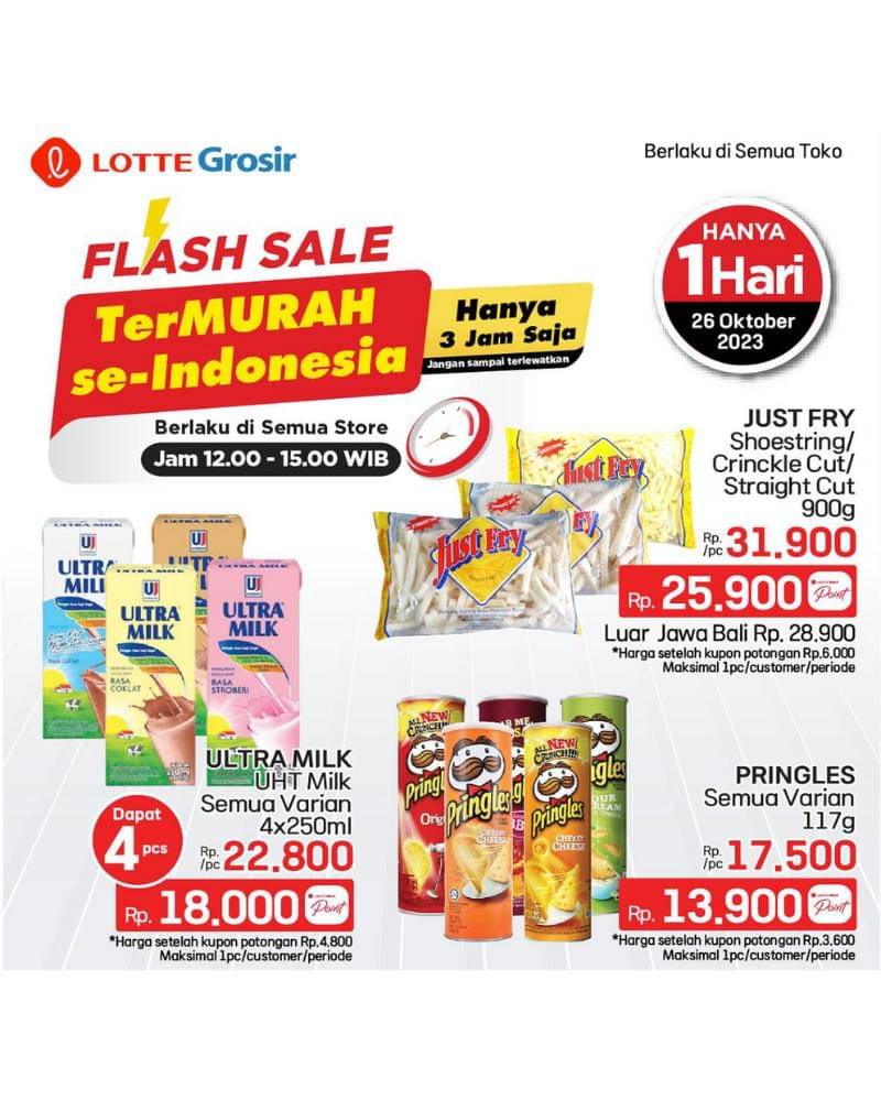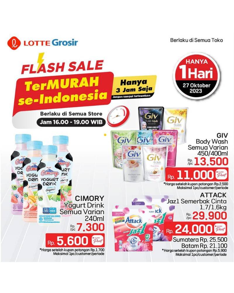 Nggak cukup 1 hari, Lotte Grosir akan lakukan flash sale lagi di 27 Oktober 2023, jam 16.00 - 19.00 di semua store. Jangan sampai ketinggalan, ya!