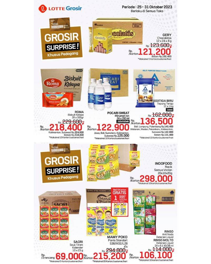 Untuk para pelaku usaha, Lotte Grosir kali ini menyediakan Grosir Surprise khusus pedagang, lho. Ada Chocolatos Gery seharga Rp 121.200/karton, lalu biskuit kelapa Roma seharga Rp 218.400/ karton, minuman ion Pocari Sweat 24x350ml dengan harga Rp 122.900/karton dan tepung terigu Segitiga Biru 12x1 kg seharga Rp 136.500.