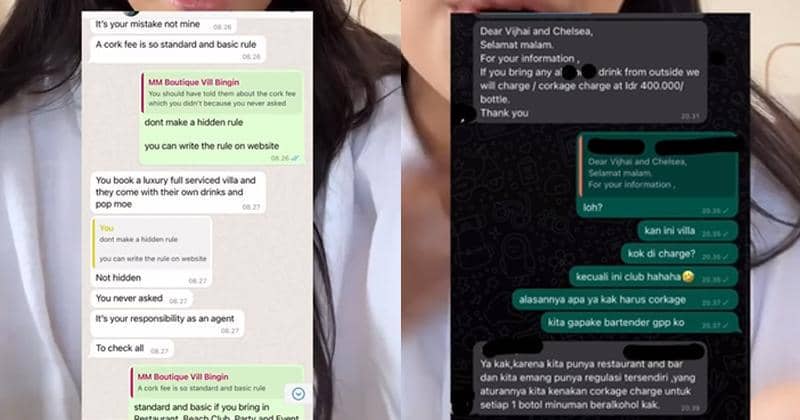 Ia juga membagikan tangkapan layar yang berisi percakapannya dengan pihak hotel. Dalam percakapan tersebut, pihak vila mempermasalahkan rombongan Rachel yang menyewa hotel mewah namun membawa minuman dan makanan instan sendiri.