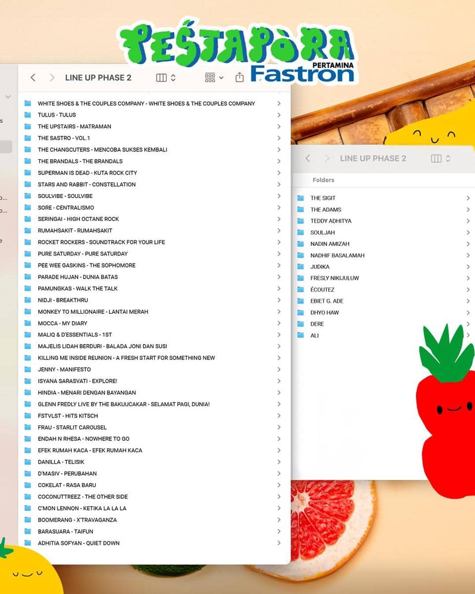 Pestapora sudah mengumumkan beberapa line up yang akan tampil tahun ini. Siapa saja mereka? Nih, berikut adalah daftar lengkap line up Pestapora Phase 1 dan Phase 2: White Shoes & The Couples Company, Tulus, The Upstairs, The Sastro, The Changcuters, The Brandals, Superman Is Dead, Stars and Rabbit, Soulvibe, Sore, Seringai, Rumahsakit, Rocket Rockers, Pure Saturday, Pee Wee Gaskins, Parade Hujan, Pamungkas, Nidji, Monkey to Millionaire, Mocca, Maliq & D'Essentials, Majelis Lidah Berduri, Killing Me Inside Reunion, Jenny, Isyana Sarasvati, Hindia, Glenn Fredly Live by The Bakucakaar, FSTVLST, FRAU, Endah N Rhesa, Efek Rumah Kaca, Danilla, D'Masiv, Cokelat, Coconuttreez, C'mon Lennon, Boomerang, Barasuara, Adhitia Sofyan, The Sigit, The Adams, Teddy Aditya, Souljah, Nadin Amizah, Nadhif Basalamah, Judika, Fresly Nikijuliuw, Ecoutez, Ebiet G Ade, Dhyo Haw, Dere, dan Ali.