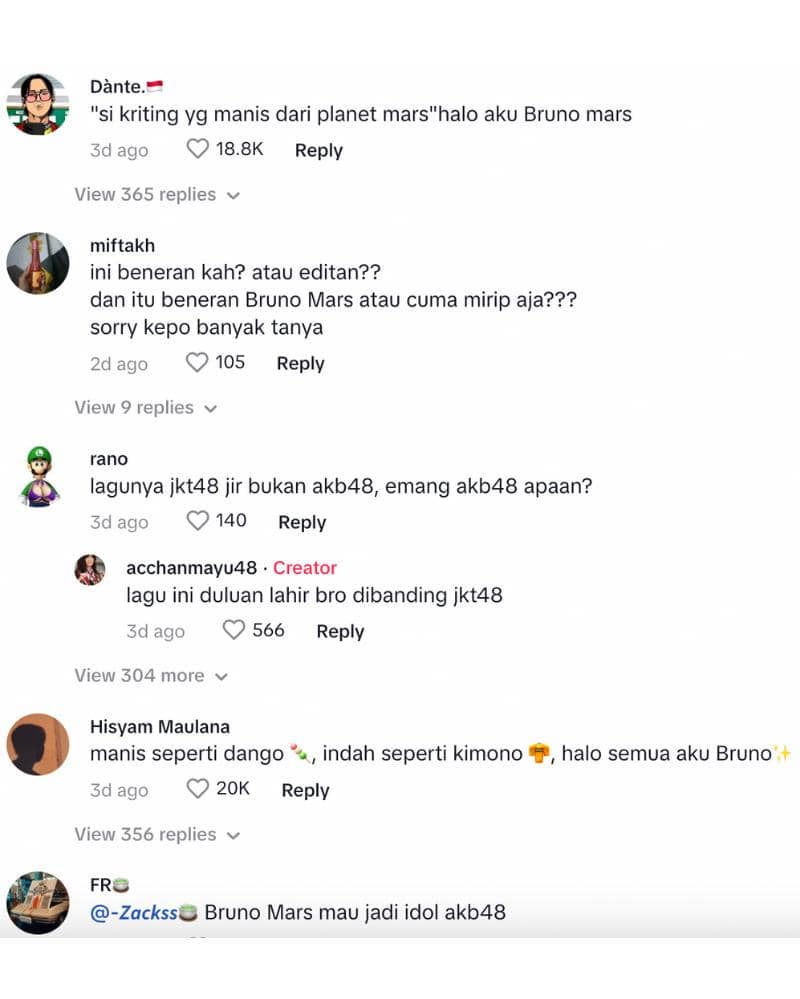 Video Bruno Mars menyanyikan "Heavy Rotation" tersebut diposting oleh akun TikTok @majijofamily48. Terdapat berbagai reaksi menarik dari pada fans Indonesia, diantaranya ada yang berkomentar, "sekelas bruno mars aja wota boss😁."
