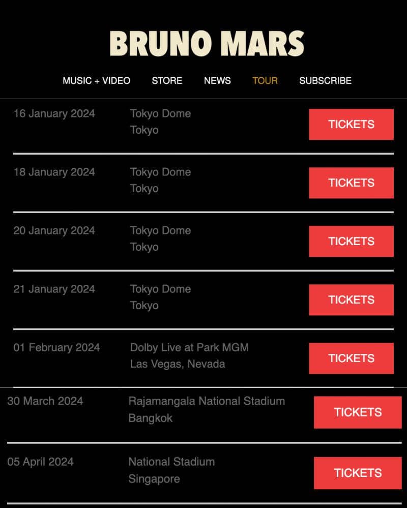 Nah, beberapa negara di Asia yang akan Bruno Mars kunjungi, sejauh ini baru Jepang, Thailand dan Singapura. Tur Bruno di Thailand akan dilaksanakan di Rajamangala National Stadium, Bangkok, pada 30 Maret 2024.