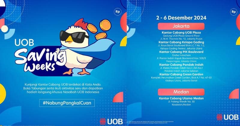 Acara ini berlangsung dari 2-6 Desember 2024 di cabang UOB Jakarta dan Medan. Selain itu juga berlangsung pada tanggal 9-13 Desember 2024 di Bandung dan Surabaya. Selain edukasi finansial, kamu juga bisa menikmati berbagai fasilitas dan permainan di UOB Saving Weeks!