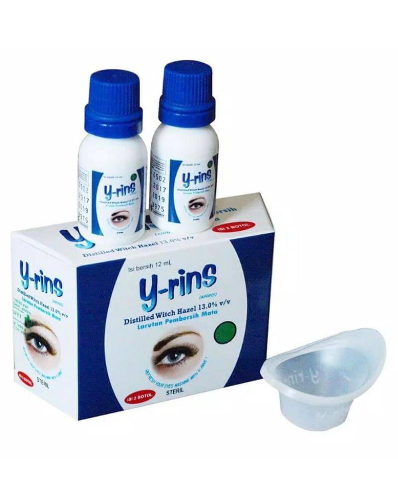 Y Rins Cuci Mata mengandung distilled witch hazel 13%, yang dipercaya sebagai sebagai agen pembersih ringan, sekaligus memberikan efek cooling pada mata.