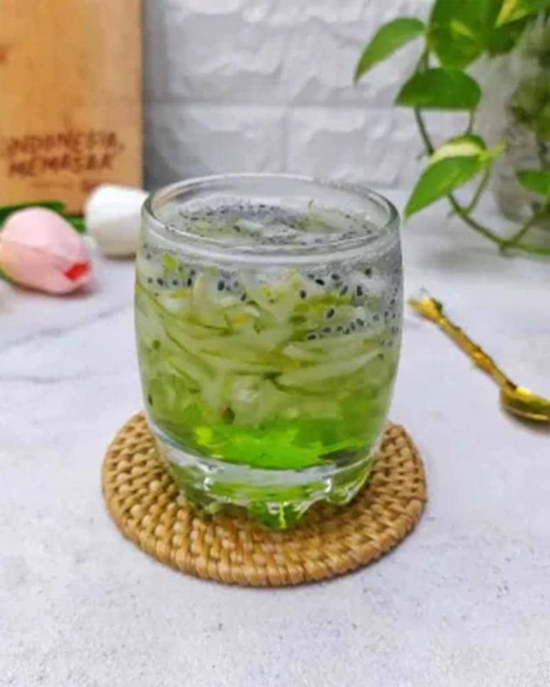 Bahannya cuma timun yang dibuang bijinya dan diserut, sirup melon, dan es batu. Segar!