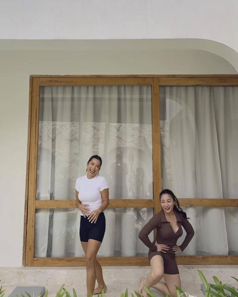 Mama Jen tampil santai dengan kaus berwarna putih dan celana pendek ketat berwarna hitam. Sedangkan Mama Nikita terlihat mengenakan jumpsuit fit body dengan warna cokelat.