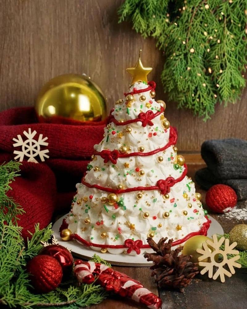 Yang satu ini cukup unik karena tidak berbentuk lingkaran atau kotak tapi berbentuk seperti pohon Natal. Berjudul white christmas cake, sebenarnya ini adalah kue dengan ganache Belgian chocolate yang nikmat.