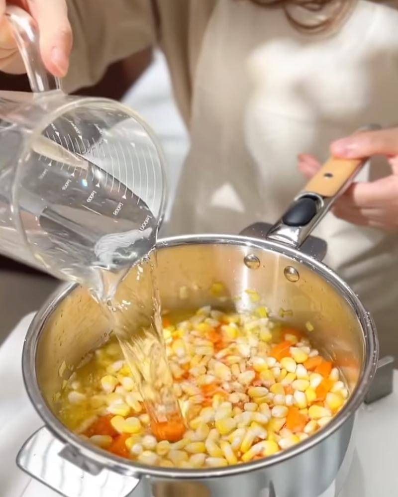 - Kemudian, masukan potongan kecil wortel, jagung serta air dan gula secukupnya.