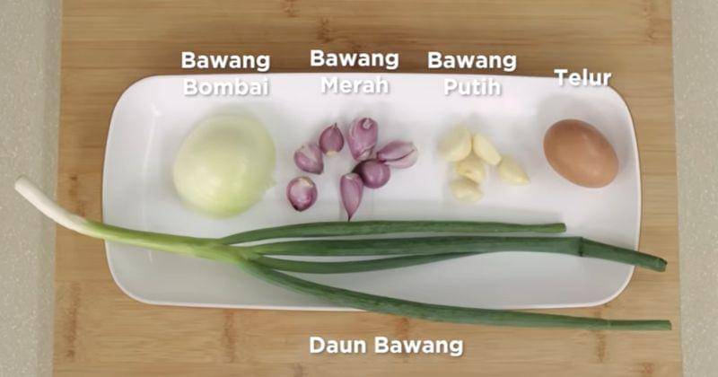 - Iris bawang putih, bawang merah, potong kotak kecil bawang bombai dan iris daun bawang.