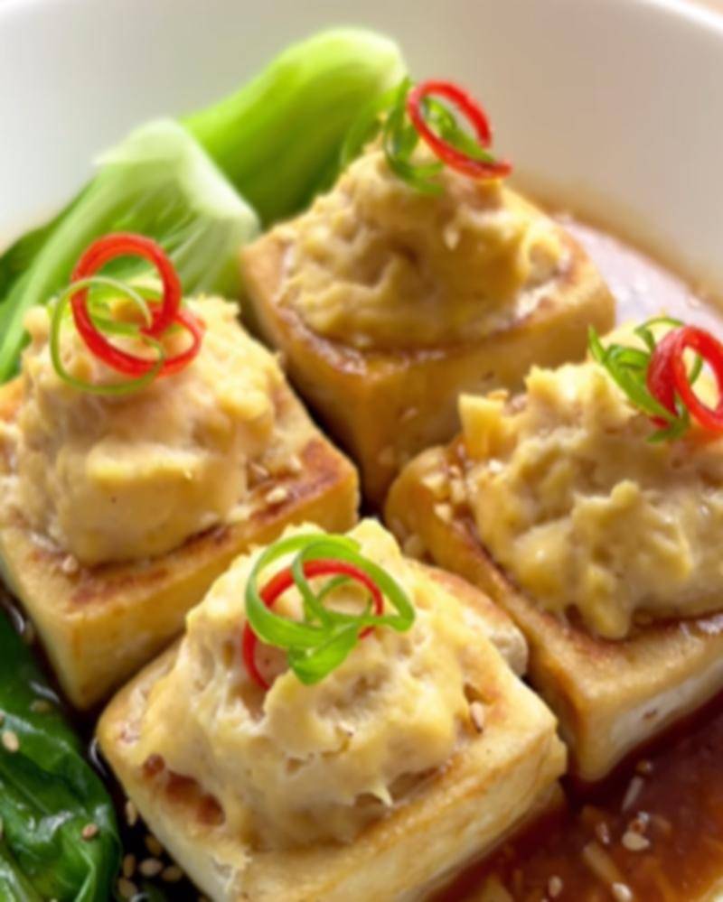 - Masukkan adonan bakso ke tahu dan tempatkan di wadah siap kukus.