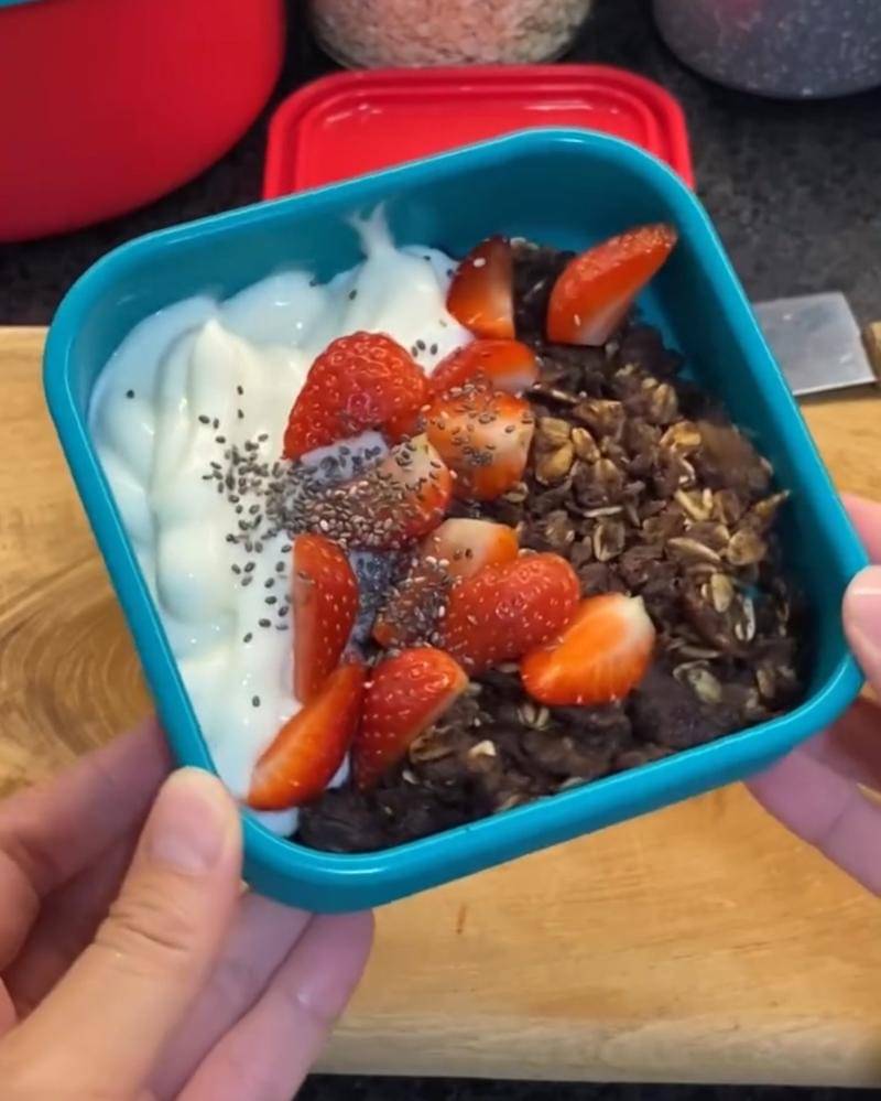- Pindahkan scrambled oat ke wadah, lalu tambahkan yogurt, dan akhiri dengan topping buah stroberi dan chia seeds.