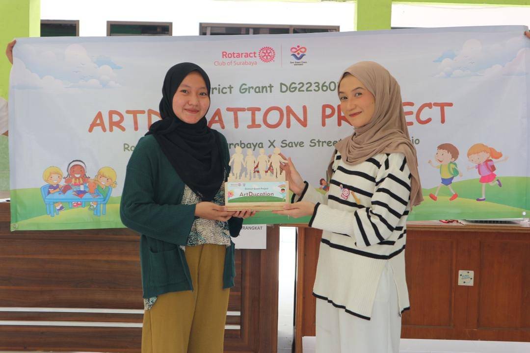 Sebagai apresiasi, Rotaract Club Surabaya memberikan plakat kenang-kenangan kepada perwakilan komunitas Save Street Child Sidoarjo sebagai tanda kerjasama partnership yang baik dalam proyek District Grant ini.