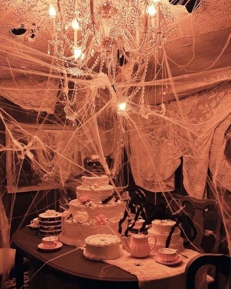 Di rumah hantunya ada sudut yang menampilkan chandelier cantik dengan kue dan meja makan mewah. Ini salah satu spot di dalam rumah hantu itu yang sangat khas Kim Kardashian.