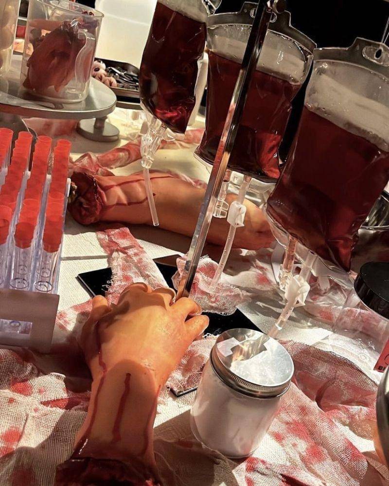 Terbukti dalam dekorasi darah di meja makan yang terbuat dari slime. Selain itu ada pula dekorasi potongan tubuh manusia lengkap dengan cipratan darah yang seolah masih segar. Seram banget!