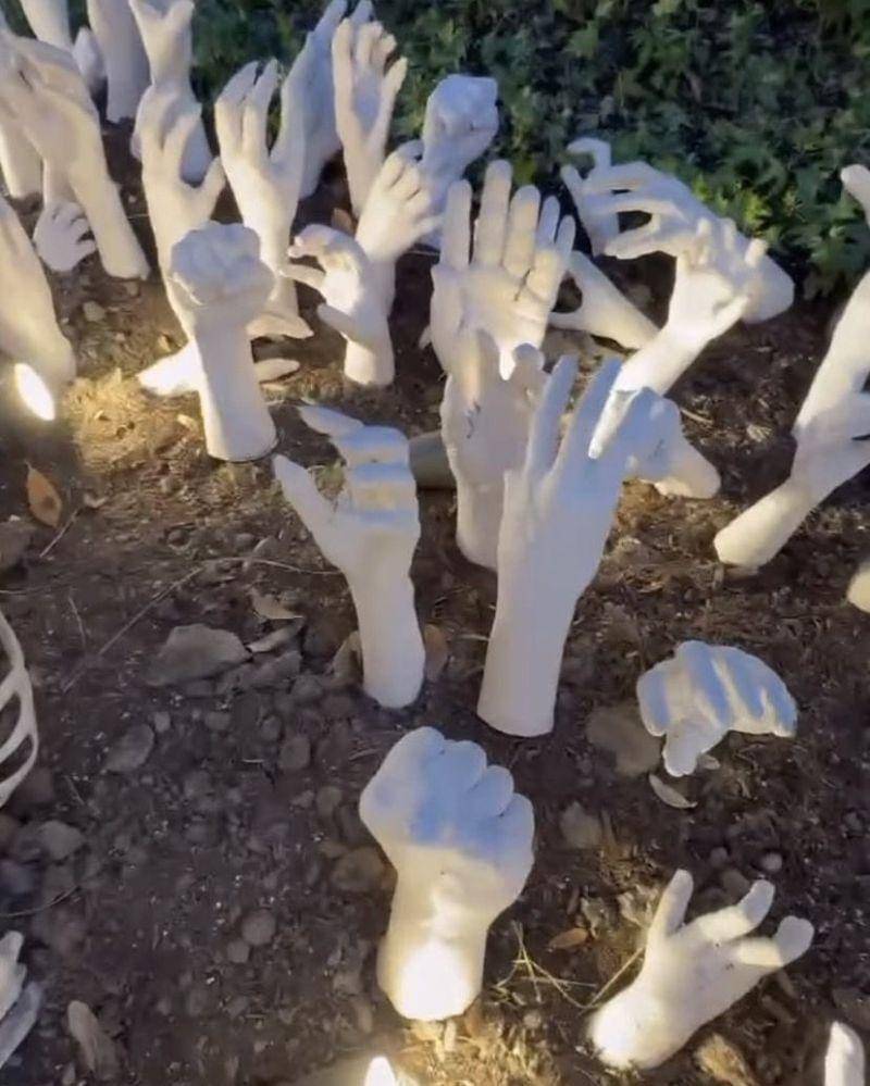 Tidak hanya dekorasi tengkorak dan tulang, Kim juga menambahkan dekorasi unik lainnya. Untuk menambah seram suasana, ada tangan-tangan kaku yang seolah muncul dari dalam tanah.