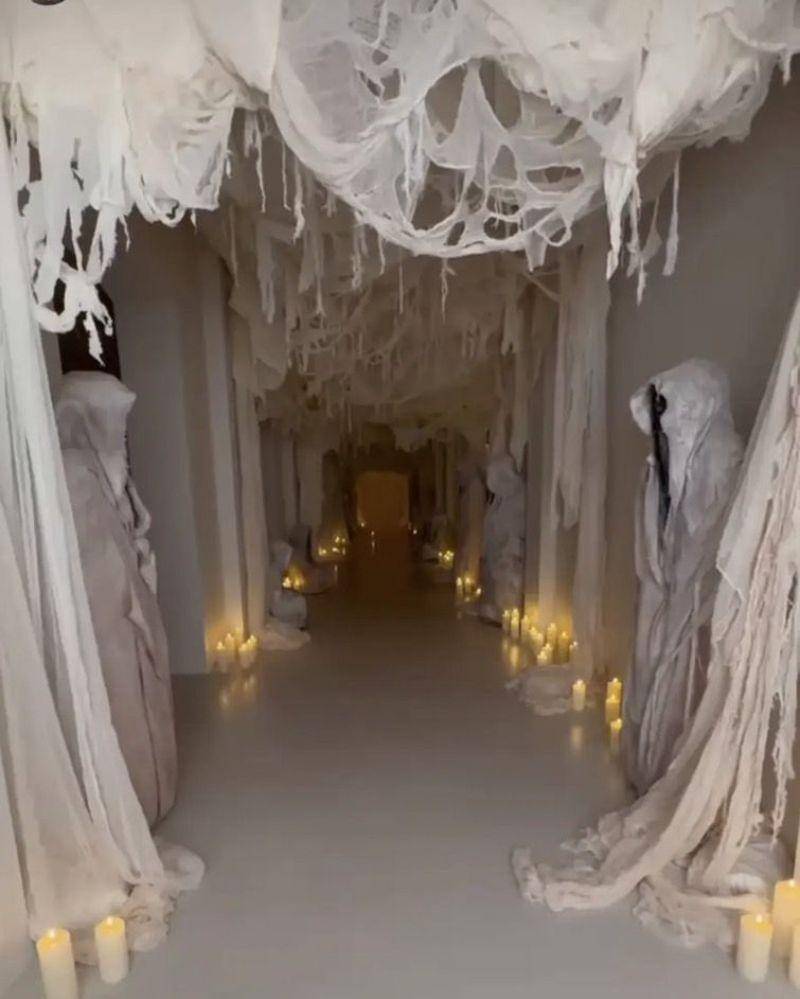 Berkaca ke tahun 2022 lalu, Kim menjadikan mumi sebagai dekorasi lorong rumah. Meski hanya sesosok besar dengan kain penutup panjang sukses menambah keseraman suasana Halloween ini.