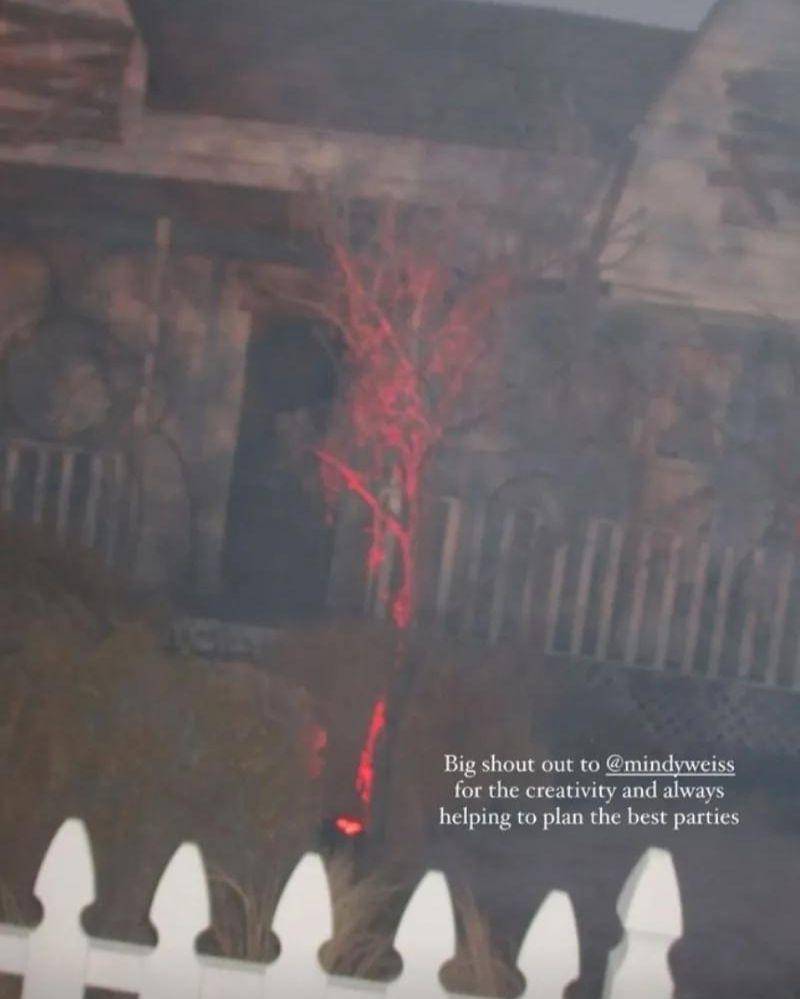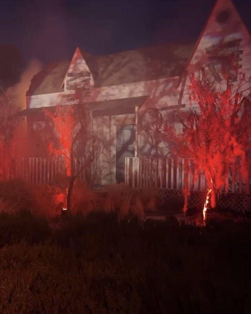 Kreatifitas Kim Kardashian untuk menyuguhkan suasana seram untuk pesta Halloween ini patut diacungi jempol. Saat malam hari, ada lampu merah yang menyorot ke rumah hantunya untuk menambah suasana seram.