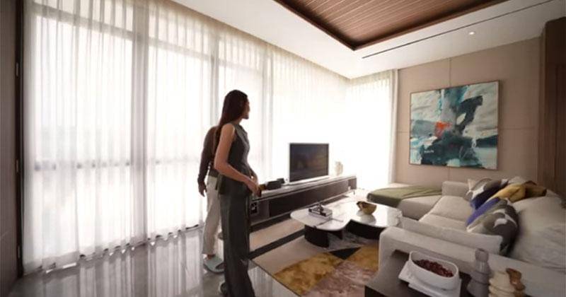 Selanjutnya, terdapat ruangan utama yang sudah terlihat berbagai perabotan mulai dari sofa hingga televisi. Area tersebut juga cukup terang berkat jendela yang mengelilinginya.