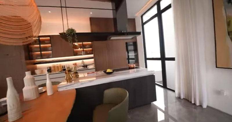 Tak jauh dari ruang keluarga, ada area dapur yang menyatu dengan meja makan. Dapurnya mengusung nuansa warm dengan dominasi cokelat kayu.