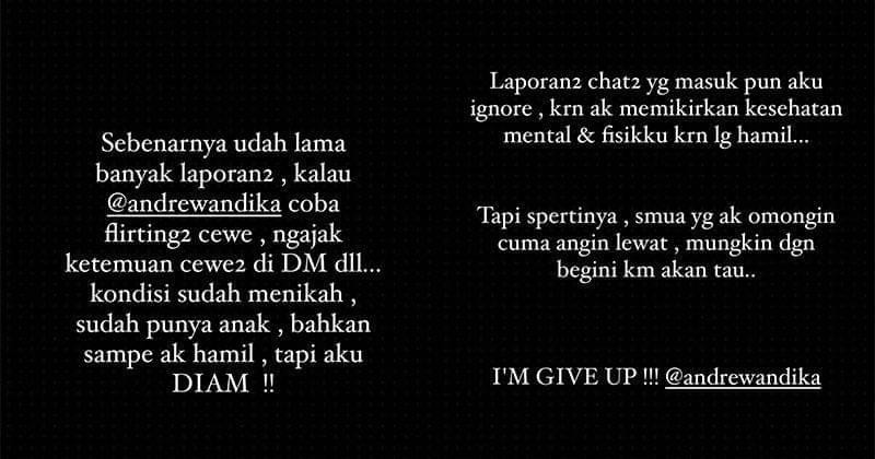 Lewat Instagram pribadinya, Tengku Dewi Putri menguak perselingkuhan suaminya dengan jelas. Ia mengaku sudah menyerah dengan sikap Andrew Andika yang terus mengulangi hubungan terlarang itu.