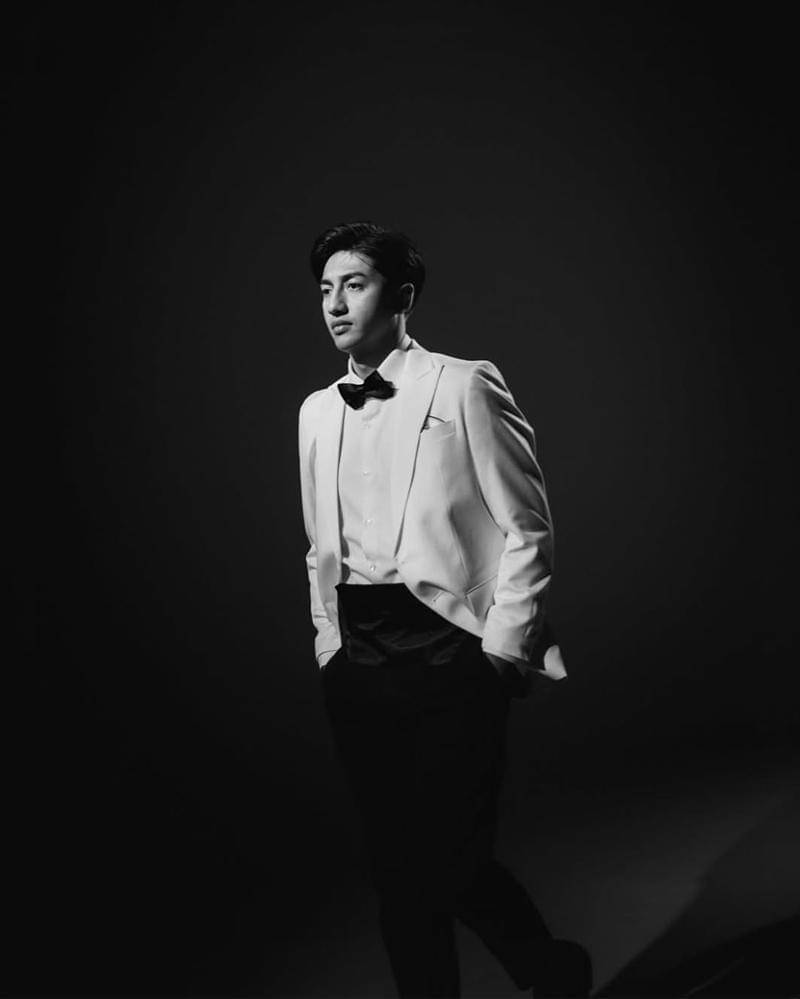 Ia berpose memasukkan kedua tangannya ke dalam kantong celana sambil berpaling dari kamera, sehingga memberikan kesan maskulin dan elegan.