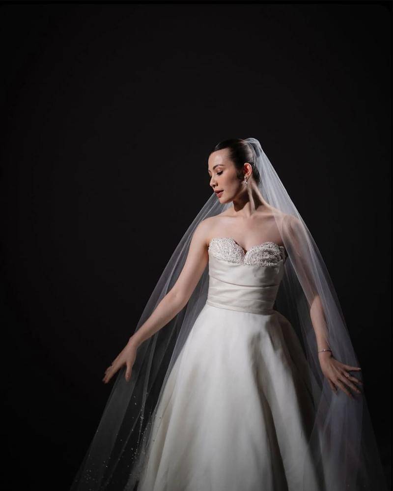 Model rambutnya disanggul dengan simpel, tetapi tetap terlihat anggu berkat wedding veil panjang yang menjuntai di belakangnya. Penampilannya tersebut benar-benar mencuri perhatian.