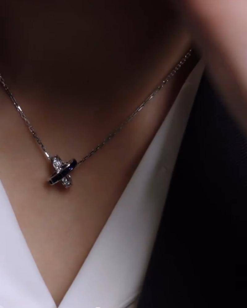 Hadiah yang satu ini memungkinkan kamu untuk kembaran dengan ambassador Chaumet, yaitu Cha Eun Woo. Liontin Jeux de Liens akan menari dengan interaksi cahaya dan menghasilkan warna yang menawan. Dibuat dengan indah dari 18K emas putih, perhiasan elegan ini menampilkan warna "biru" khas Maison dengan batu safir berpotongan persegi yang indah. Warna birunya yang cerah semakin terlihat dengan paduan berlian yang menyala cemerlang.