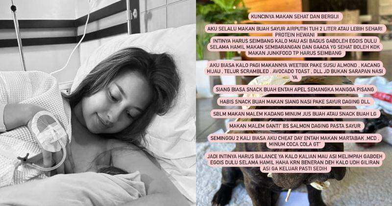 Melalui media sosial Instagramnya, kekasih Dali Wassink ini juga kerap berbagi tips mengenai proses menyusui. Salah satunya ia sempat memberitahu para pengikutnya mengenai pola makan selama menjadi busui. Pola makan ini sudah mulai ia terapkan sejak hari pertama melahirkan, tujuannya supaya produksi ASI melimpah.