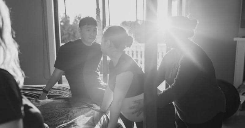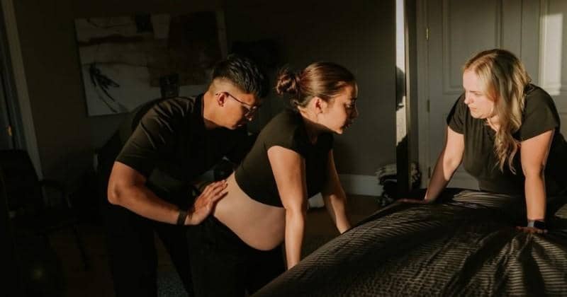 Selain melakukan double hip squeeze dengan bantuan doula, Nikita juga dibantu oleh Indra. Sambil berpegangan di ujung tempat tidur, ia melakukan yang terbaik untuk membawa buah hatinya ke dunia.