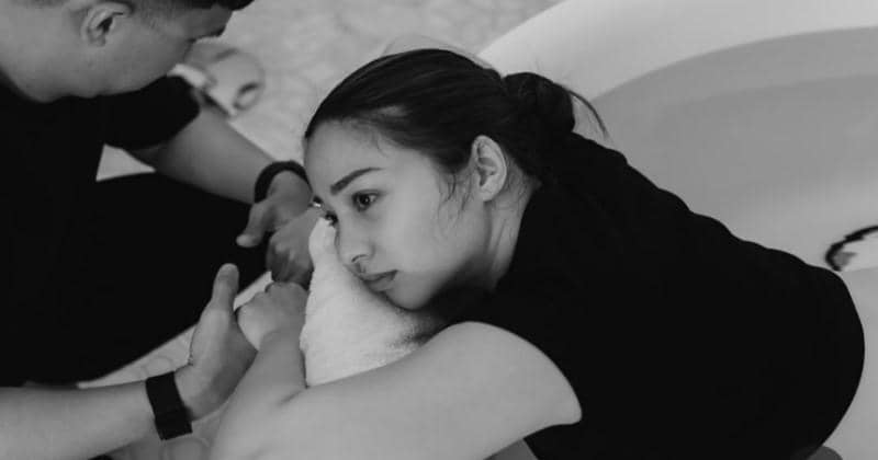 Memilih melahirkan dengan cara water birth, Niki akhirnya masuk ke kolam air untuk menyambut persalinan. Dengan posisi tengkurap, ia merebahkan kepala di tepi kolam sambil berpegangan erat dengan Indra.