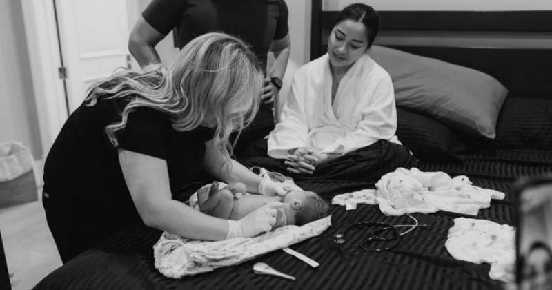 Setelah tali pusat diputus dan Nael sudah dimandikan dengan bersih, ia pun kembali diurus oleh doula. Tentu saja, Mama Niki memerhatikan dengan seksama.